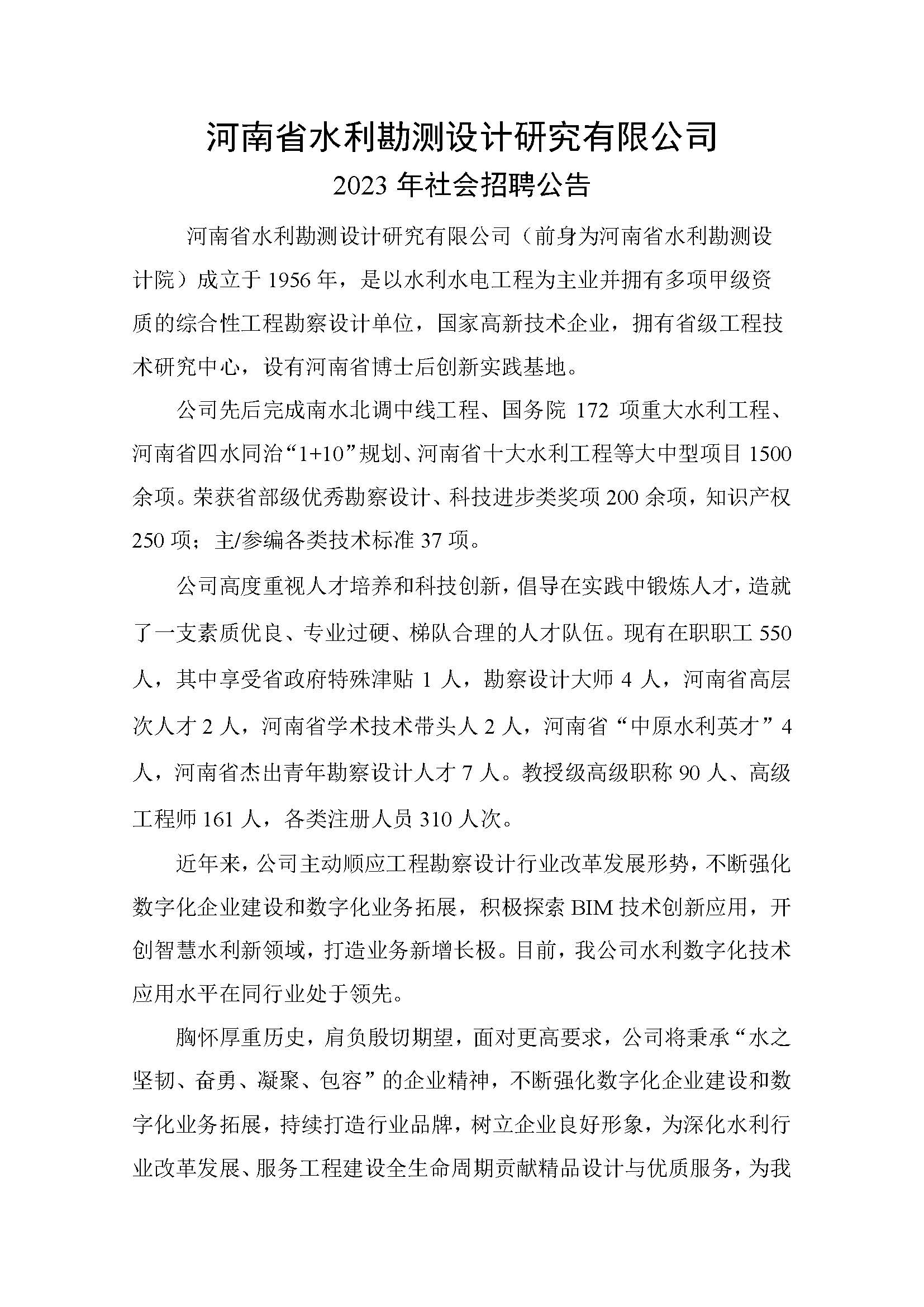 附件1:河南省水利勘測設計研究有限公司2023年社會招聘計劃.pdf