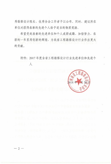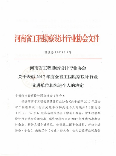 1月30日,河南省工程勘察設(shè)計行業(yè)協(xié)會發(fā)布“豫設(shè)協(xié)[2018]3號”文件,對2017年度全省工程勘察設(shè)計行業(yè)先進單位和先進個人進行了表彰。設(shè)計公司榮獲“河南省2017年度優(yōu)秀勘察設(shè)計企業(yè)”、“河南省2017年度工程勘察設(shè)計行業(yè)精神文明先進單位”、“河南省2017年度工程勘察設(shè)計行業(yè)熱心公益事業(yè)獎”等3項殊榮,公司董事長翟淵軍獲得“優(yōu)秀勘察設(shè)計院長”榮譽稱號,數(shù)字工程院白勇獲得“優(yōu)秀協(xié)會(學(xué)會)工作者”榮譽稱號。表彰文件如下: