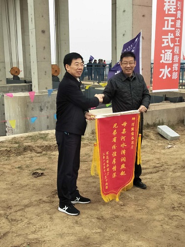 為慶祝工程基本完工并開始試通水,項目行政主管單位河北省水利廳在沉沙池進口舉辦了簡單的引黃入冀補淀工程通水儀式,河南省水利廳、黃河水利委員會、濮陽市人民政府以及各參建單位共百余人參加了通水儀式。我公司趙廷華副總經理及現場設代作為設計方代表參加了該儀式。