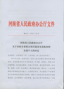 8月16日,河南省人民政府辦公廳發(fā)布《關(guān)于表彰全省重點(diǎn)項目建設(shè)先進(jìn)集體和先進(jìn)個人的決定》 [豫政辦〔2017〕92號]文件,對鄭州城建集團(tuán)投資有限公司等40個先進(jìn)集體和賈要偉等114名先進(jìn)個人予以表彰,設(shè)計公司被評為全省重點(diǎn)項目建設(shè)先進(jìn)集體。全文內(nèi)容如下: