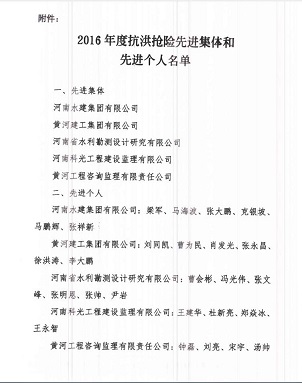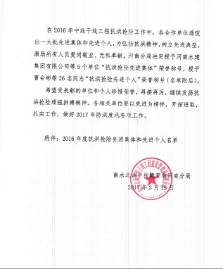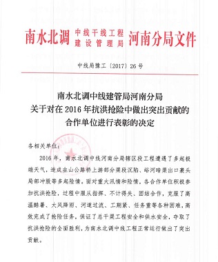 3月15日,南水北調(diào)中線干線工程建設管理局河南分局對在2016年抗洪搶險中做出突出貢獻的合作單位進行了表彰。我公司榮獲“2016年度抗洪搶險先進集體”稱號,曹會彬、馮光偉等6位同志獲得“2016年度抗洪搶險先進個人”稱號。表彰文件如下: