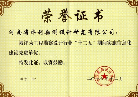 “十二五”期間,我公司以信息化為企業發展的重要原動力,先后在綜合信息平臺建設、三維協同設計平臺建設、水利信息化業務拓展等方面取得了長足的發展,公司管理水平、規劃設計產品質量、公司業務拓展等實現了跨越式發展,得到了業內的認可,被中國勘察設計協會評為工程勘察設計行業“十二五”期間實施信息化建設“先進單位”!數字工程中心主任高英獲得 “先進個人”榮譽稱號!