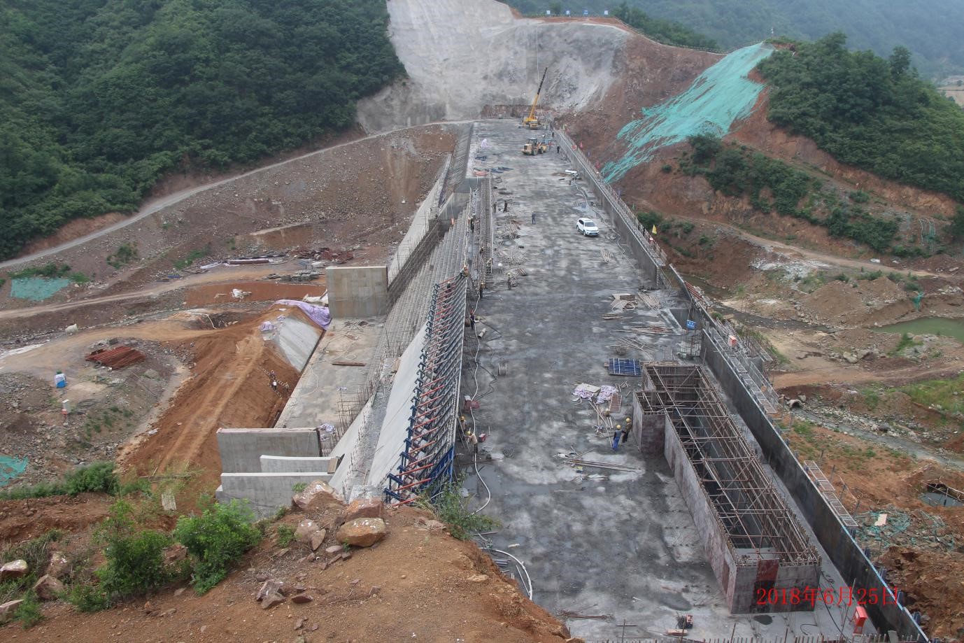 該工程于2016年7月22日正式開工建設;2016年10月25日一期導流完成;2016年11月30日壩基石方開挖完成;2016年12月18日開始澆筑壩基墊層砼;2017年4月18日開始壩體碾壓混凝土施工。