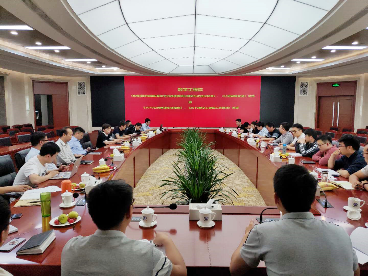 2019 年5月10日,數字工程院《彭樓灌區續建配套與節水改造量測水監測系統建設項目》(以下簡稱彭樓灌區項目)總結、《公司網絡安全》宣講暨《2019年公司管理年會精神》、《2019年數字工程院工作目標》宣貫會在公司二樓會議室召開,數字工程院全體成員參會。