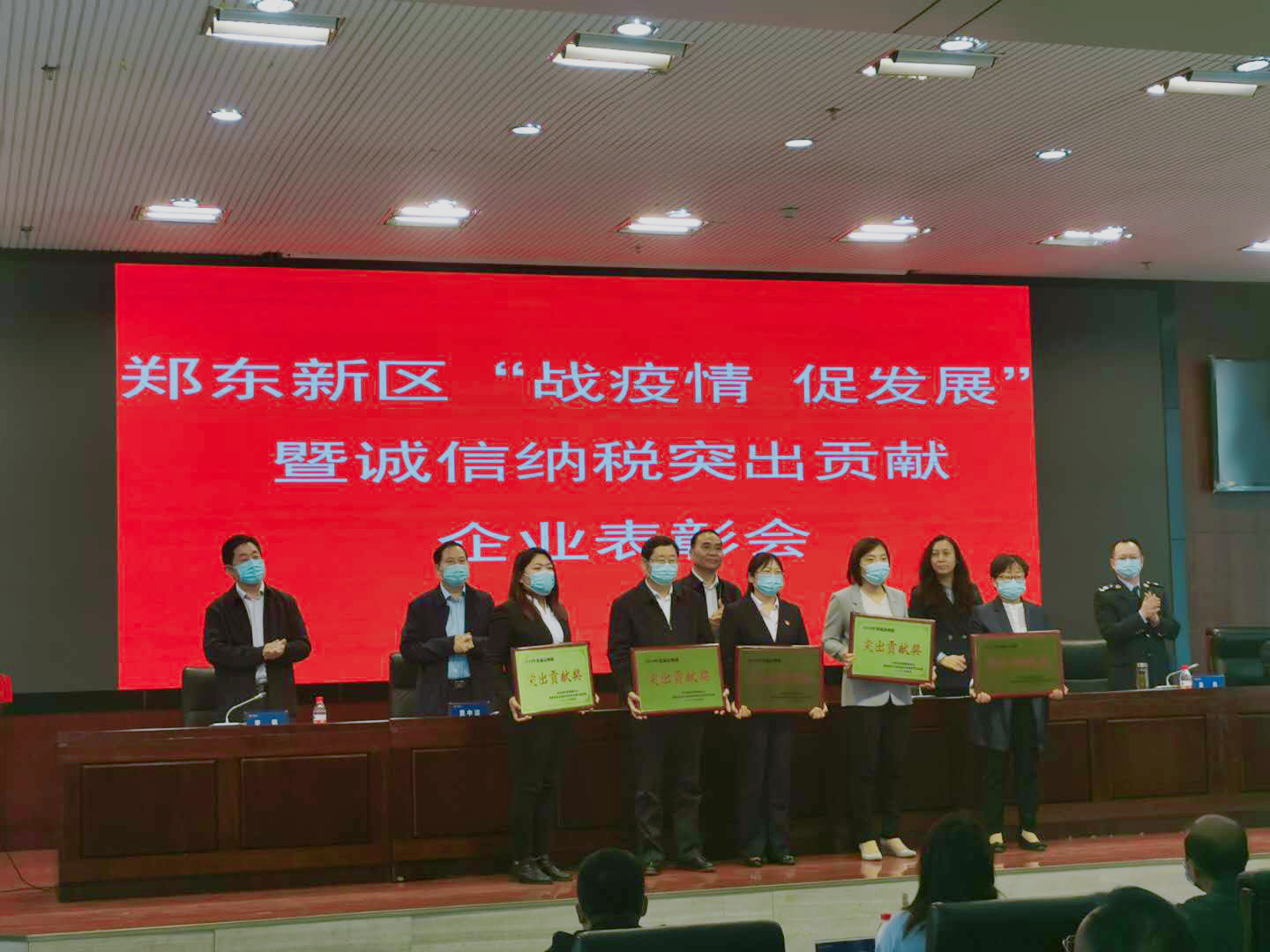 鄭東新區(qū)管委會(huì)主任周軍營(yíng)和鄭東新區(qū)稅務(wù)局局長(zhǎng)賈中誼參加會(huì)議并頒獎(jiǎng)。集團(tuán)公司翟淵軍董事長(zhǎng)參加了頒獎(jiǎng)儀式,財(cái)務(wù)資產(chǎn)部馮海霞部長(zhǎng)列席。