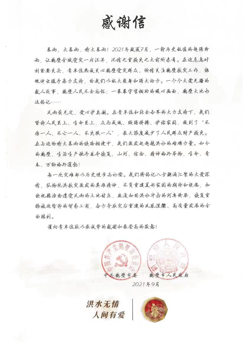 近日,中共鶴壁市委、市政府發來感謝信,對豫水設計公司在抗洪搶險關鍵時刻給予幫助表示由衷的感謝。