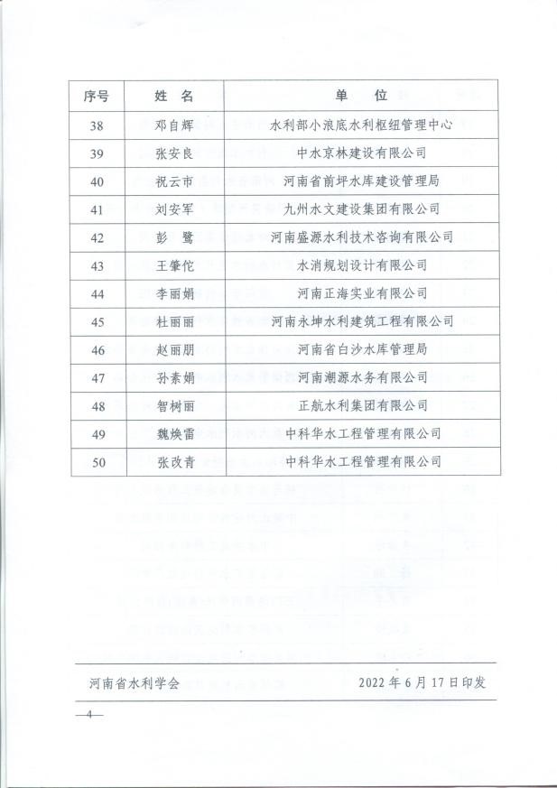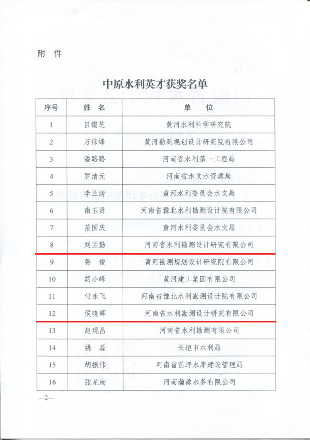 安增強、耿昕、劉曉琴同志獲得河南省勘察設計協會給予的“河南省優秀青年勘察設計師”表彰;寧保輝、馬山玉、白勇、魏常琦同志被河南省工程勘察設計行業協會列入“第一屆中原杰出青年勘察設計人才”培養名單;劉蘭勤、侯曉輝同志被河南省水利學會評為“中原水利英才”。