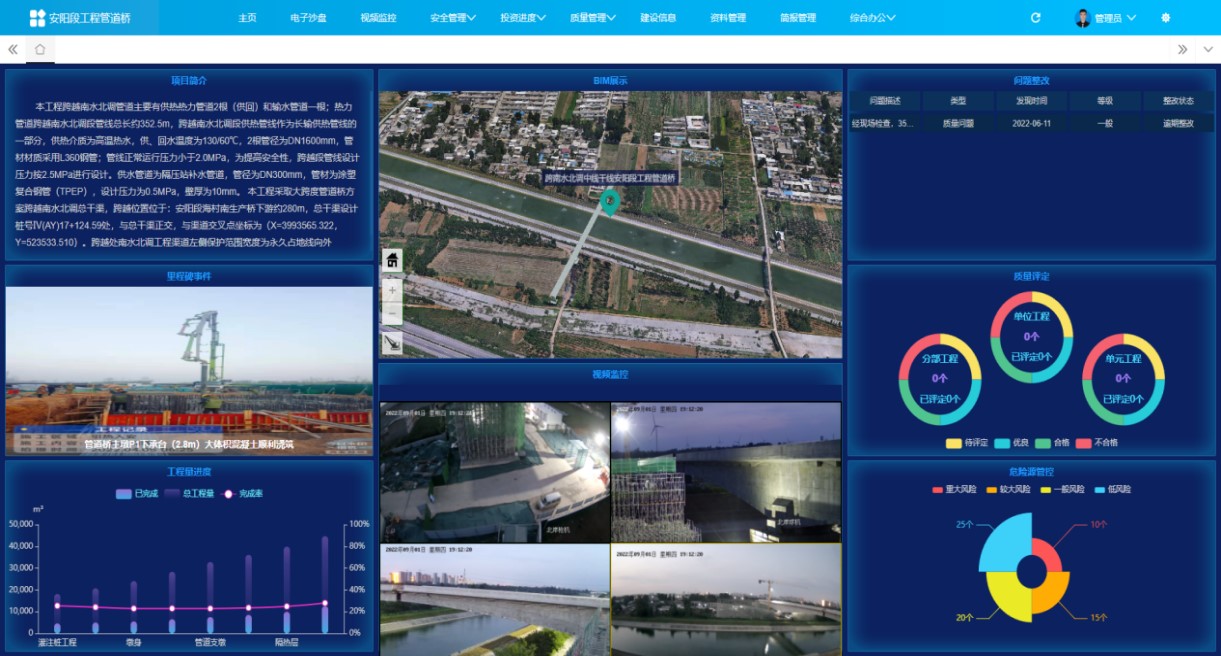 豫水設計公司工程管理院負責項目管理工作,把重心放在項目策劃和實施階段,集中力量分析管道橋工程實施的難點、工程風險、疫情防控壓力等,科學合理的制定管理計劃,充分發(fā)揮南水北調中線總干渠工程主設單位的技術優(yōu)勢,開發(fā)了基于BIM和大數(shù)據(jù)技術的項目信息化管理平臺,建立了工程三維虛擬模型,融合現(xiàn)場各維度的管理數(shù)據(jù),為管理決策提供實時、便捷、高效的信息化技術支撐。