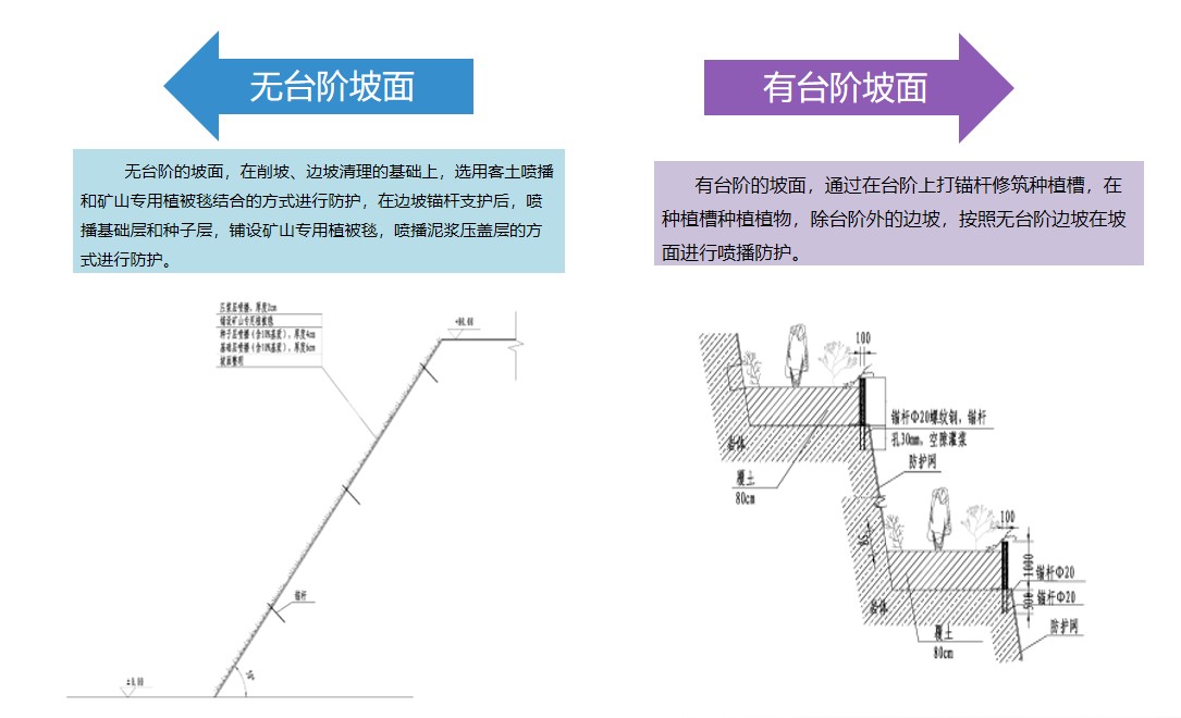 根據(jù)不同的邊坡型式,綜合采用消坡、排險(xiǎn)、錨固、掛網(wǎng)、噴播、種植穴/槽等不同的技術(shù)措施,以及藤、灌、草等多種植物搭配組合,實(shí)現(xiàn)邊坡復(fù)綠與生境的自我修復(fù)和構(gòu)建。