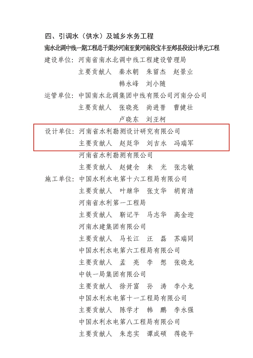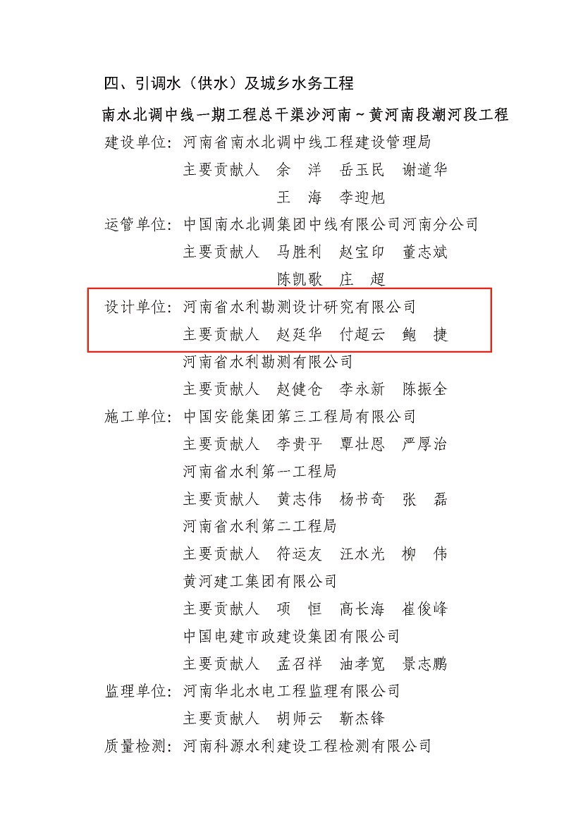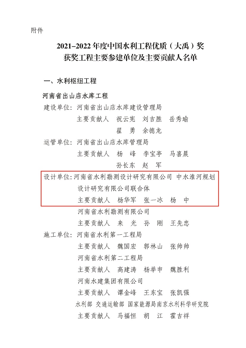 近日,經(jīng)中國(guó)水利工程優(yōu)質(zhì)(大禹)獎(jiǎng)評(píng)審委員會(huì)評(píng)審及公示,公司參與設(shè)計(jì)的《河南省出山店水庫(kù)工程》《南水北調(diào)中線一期工程總干渠沙河南~黃河南段潮河段工程》《南水北調(diào)中線一期工程總干渠沙河南至黃河南段寶豐至郟縣段設(shè)計(jì)單元工程》三項(xiàng)工程榮獲2021-2022年度中國(guó)水利工程優(yōu)質(zhì)(大禹)獎(jiǎng)。