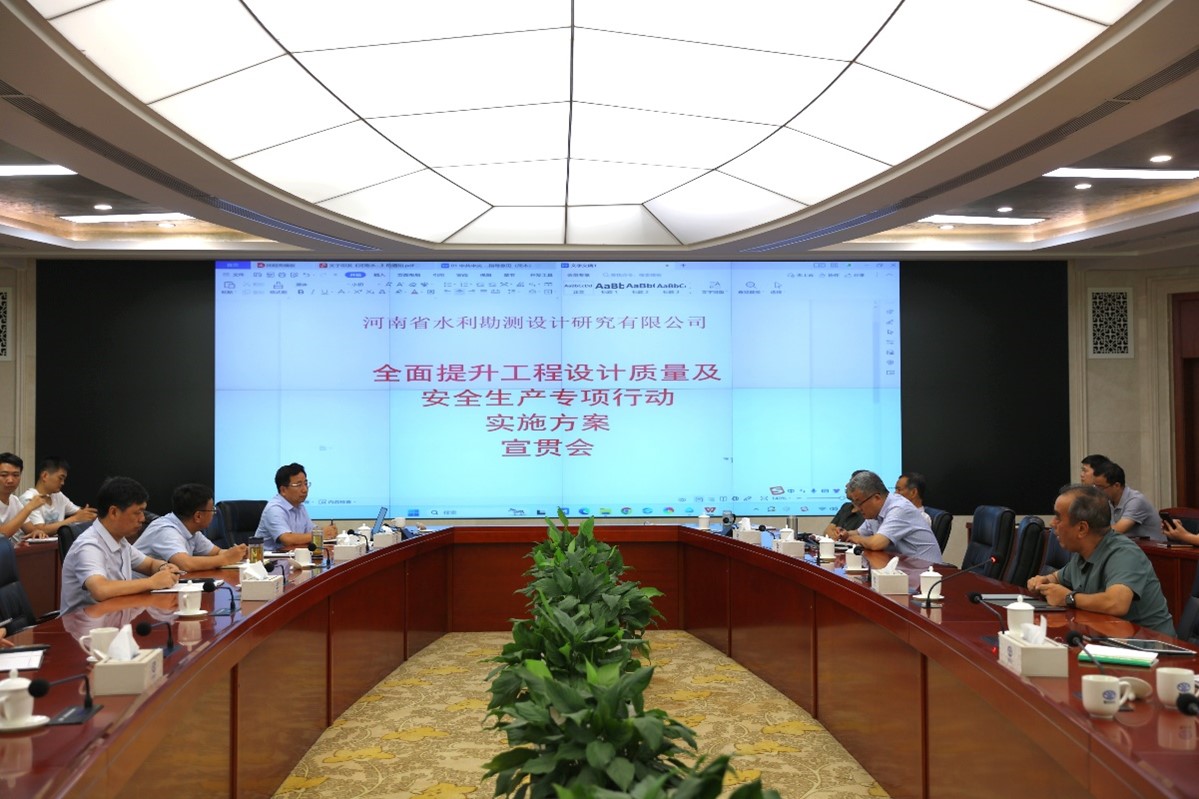 為貫徹落實(shí)《河南水利投資集團(tuán)有限公司全面提升工程建設(shè)管理水平專項(xiàng)行動(dòng)實(shí)施方案》(豫水投〔2023〕151 號(hào))精神,結(jié)合《水利部辦公廳關(guān)于印發(fā)2023年度水利工程建設(shè)質(zhì)量提升工作方案的通知》(辦建設(shè)〔2023〕94號(hào))、水利部《水利建設(shè)項(xiàng)目稽察工作指導(dǎo)手冊》(2023年版)和省委省政府、省水利廳有關(guān)部署要求,全面提升工程設(shè)計(jì)質(zhì)量和安全生產(chǎn)管理,2023年7月25日下午,公司在二樓會(huì)商中心特舉辦“全面提升工程設(shè)計(jì)質(zhì)量及安全生產(chǎn)專項(xiàng)行動(dòng)實(shí)施方案”宣貫會(huì),會(huì)議由總經(jīng)理朱太山主持,技術(shù)總監(jiān)楊華軍進(jìn)行宣貫。公司副總經(jīng)理賈少燕、趙廷華、監(jiān)事會(huì)主席閆汝華、公司技術(shù)副總監(jiān)、各生產(chǎn)部門班子成員及各項(xiàng)目設(shè)總共100余人參會(huì)。