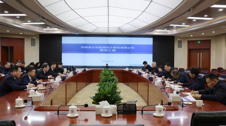 周貴恒一行參觀了豫水設計公司院史陳列廳,聽取了豫水設計公司整體工作開展情況匯報,并與公司領導班子、各院部主要負責同志進行座談。