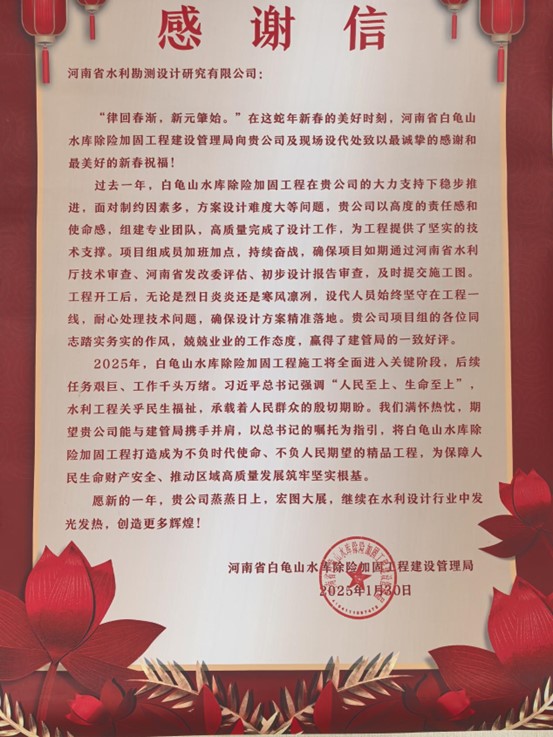 2月14日上午,河南省白龜山水庫除險加固工程建設管理局趙東城局長一行到訪公司,送來“精心設計鑄精品,團隊協作展風采”的錦旗和感謝信,以感謝公司在白龜山水庫除險加固工程前期審批及建設期間的傾力付出。