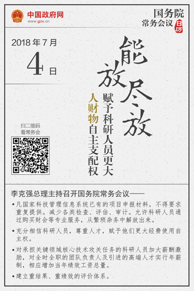 當天會議確定進一步擴大科研人員自主權的措施。李克強指出,要落實習近平總書記在兩院院士大會上的重要講話精神,按照黨中央、國務院部署,深化科技領域“放管服”改革,按照能放盡放的要求賦予科研人員更大的人財物自主支配權,充分調動他們的積極性,激發創新活力,壯大經濟發展新動能。