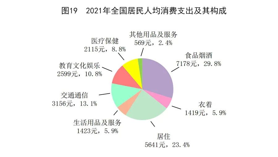 全年全國居民人均消費支出24100元,比上年增長13.6%,扣除價格因素,實際增長12.6%。其中,人均服務(wù)性消費支出10645元,比上年增長17.8%,占居民人均消費支出的比重為44.2%。按常住地分,城鎮(zhèn)居民人均消費支出30307元,增長12.2%,扣除價格因素,實際增長11.1%;農(nóng)村居民人均消費支出15916元,增長16.1%,扣除價格因素,實際增長15.3%。全國居民恩格爾系數(shù)為29.8%,其中城鎮(zhèn)為28.6%,農(nóng)村為32.7%。