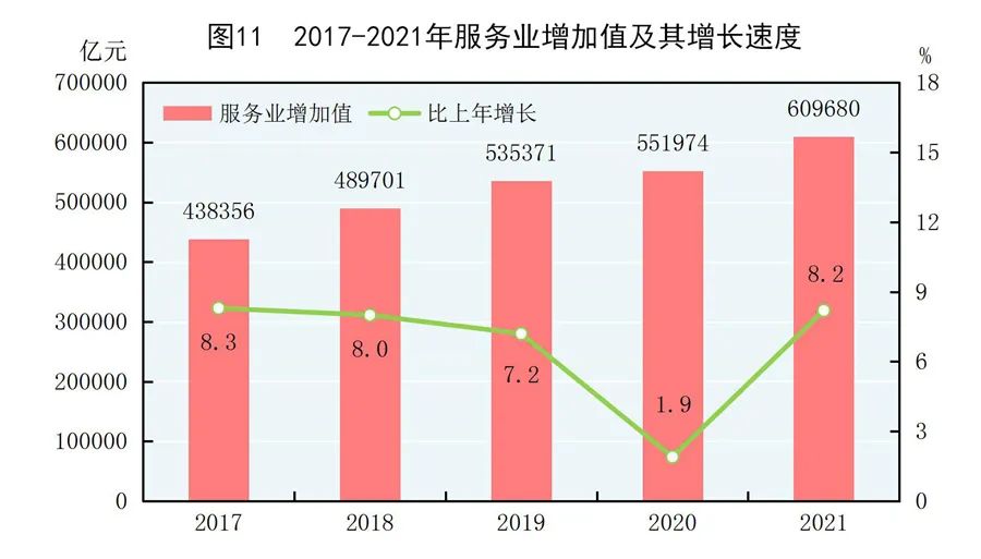 全年批發(fā)和零售業(yè)增加值110493億元,比上年增長11.3%;交通運輸、倉儲和郵政業(yè)增加值47061億元,增長12.1%;住宿和餐飲業(yè)增加值17853億元,增長14.5%;金融業(yè)增加值91206億元,增長4.8%;房地產(chǎn)業(yè)增加值77561億元,增長5.2%;信息傳輸、軟件和信息技術(shù)服務(wù)業(yè)增加值43956億元,增長17.2%;租賃和商務(wù)服務(wù)業(yè)增加值35350億元,增長6.2%。全年規(guī)模以上服務(wù)業(yè)企業(yè)營業(yè)收入比上年增長18.7%,利潤總額增長13.4%。