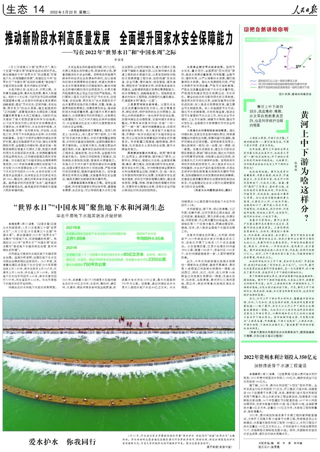 3月22日是第三十屆“世界水日”,第三十五屆“中國水周”的宣傳活動也同時開啟。聯合國確定今年“世界水日”的主題是“珍惜地下水,珍視隱藏的資源”,我國紀念今年“世界水日”“中國水周”活動的主題是“推進地下水超采綜合治理復蘇河湖生態環境”。