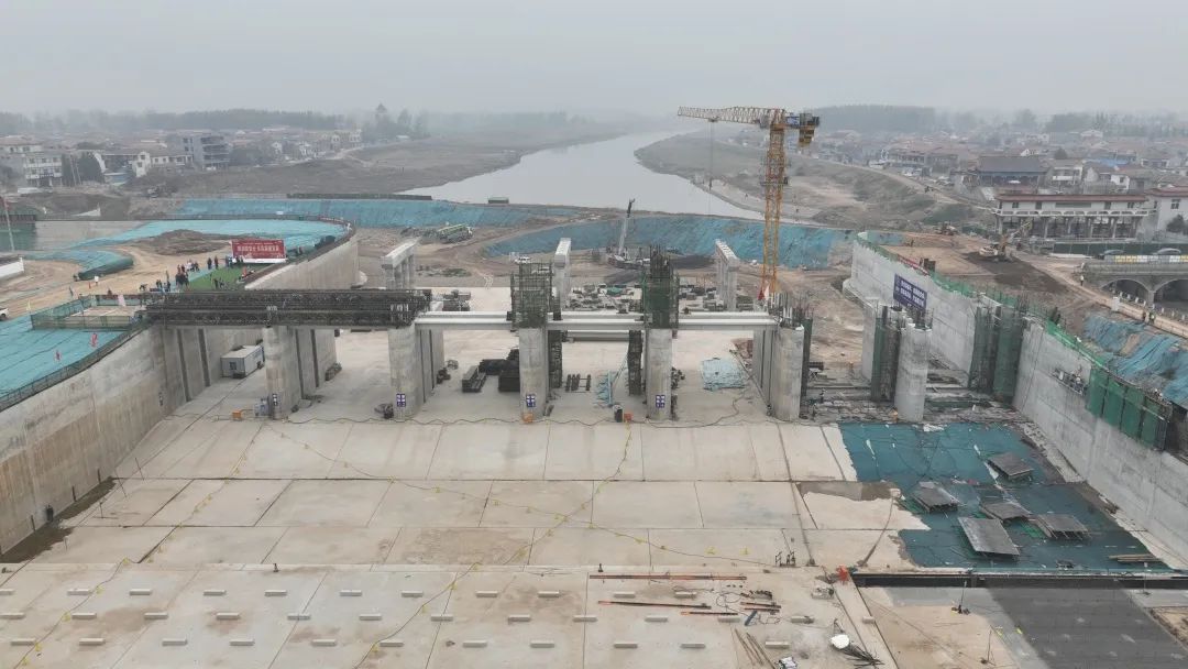 賈魯河綜合治理工程西華縣閆崗閘閘門及貝雷架安裝施工現(xiàn)場(盧漢 攝)